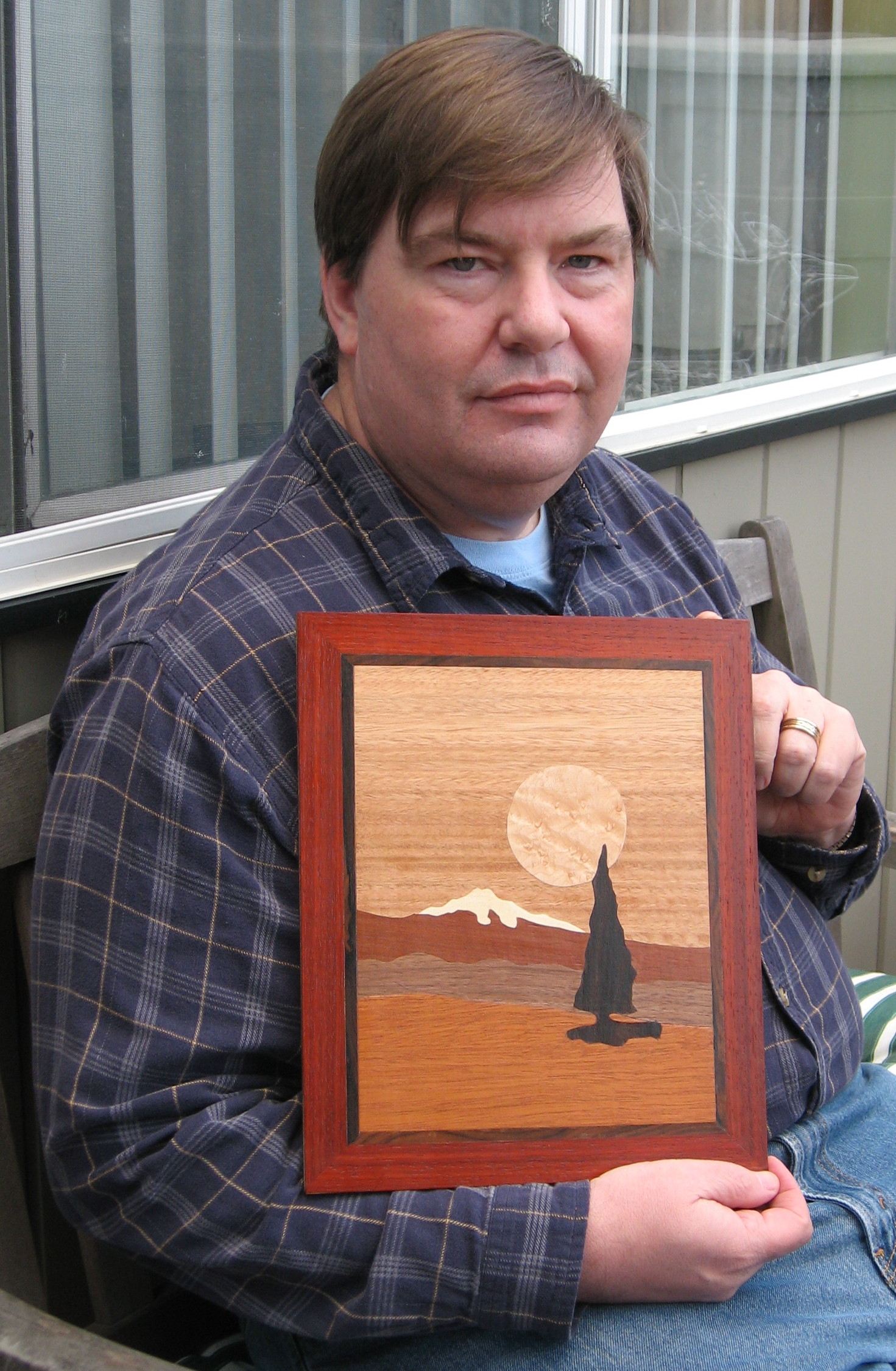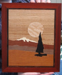 Here are two pictures of my first attempt at marquetry. The picture is made from pieces of wood veneer that are cut on a scroll saw and then glued to a MDF board. After the glue dried I applied a clear lacquer finish. I did this piece as part of a beginning marquetry class at the Nor-Cal Chapter of the American Marquetry Society of which I am now a member.