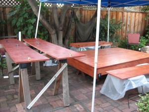Here are the major pieces all assembled and ready for installation. You’ll note that the parts are set up outside on the patio. I have a very small work shop and a project this size just does fit so we set up the canopy and did much of the work in the back yard. Heather applied all the finish out here.