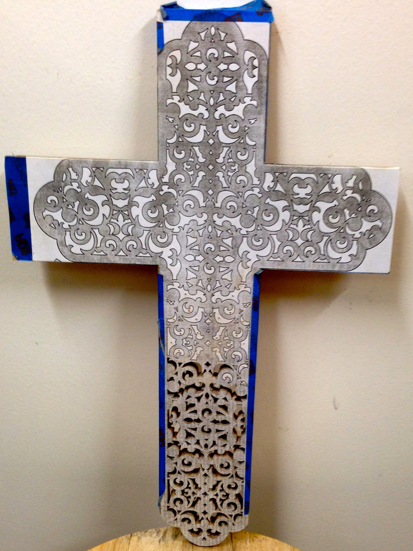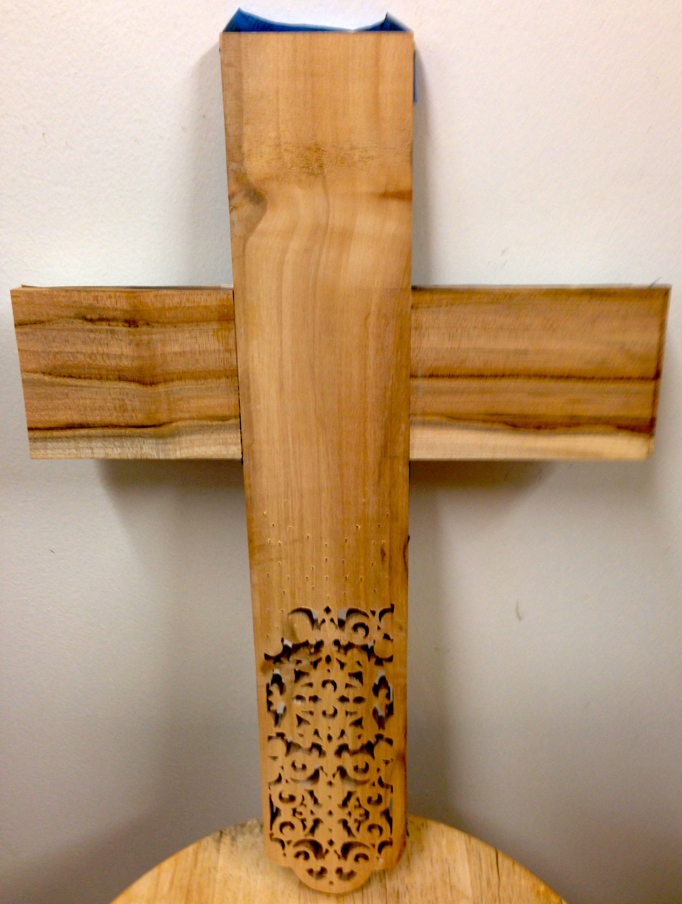 Here’s the cross on the scroll saw. Yes, I have to use the magnifier to see while cutting.