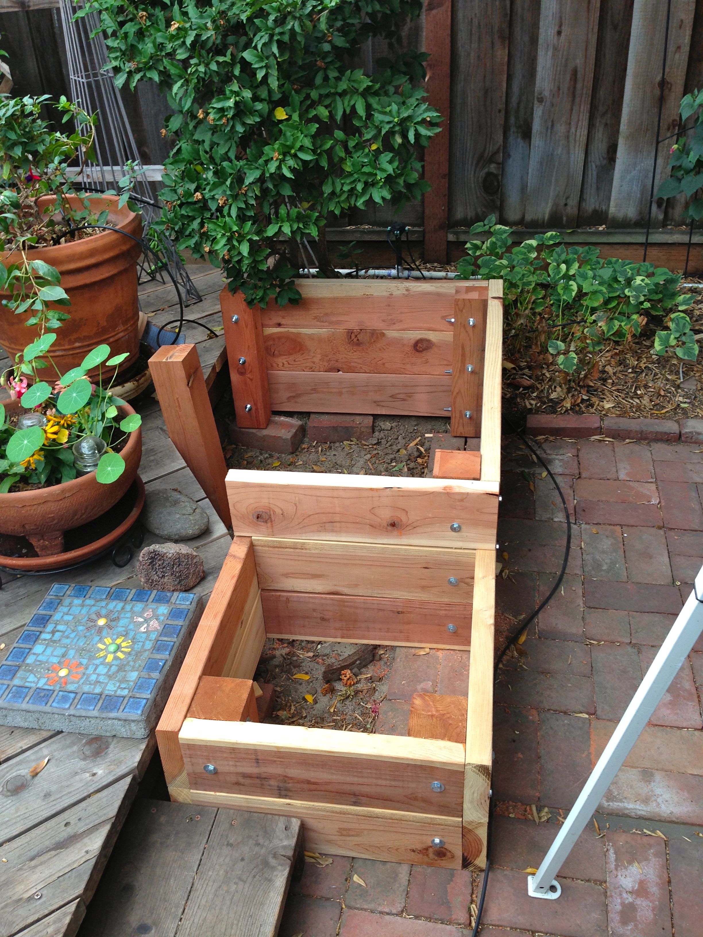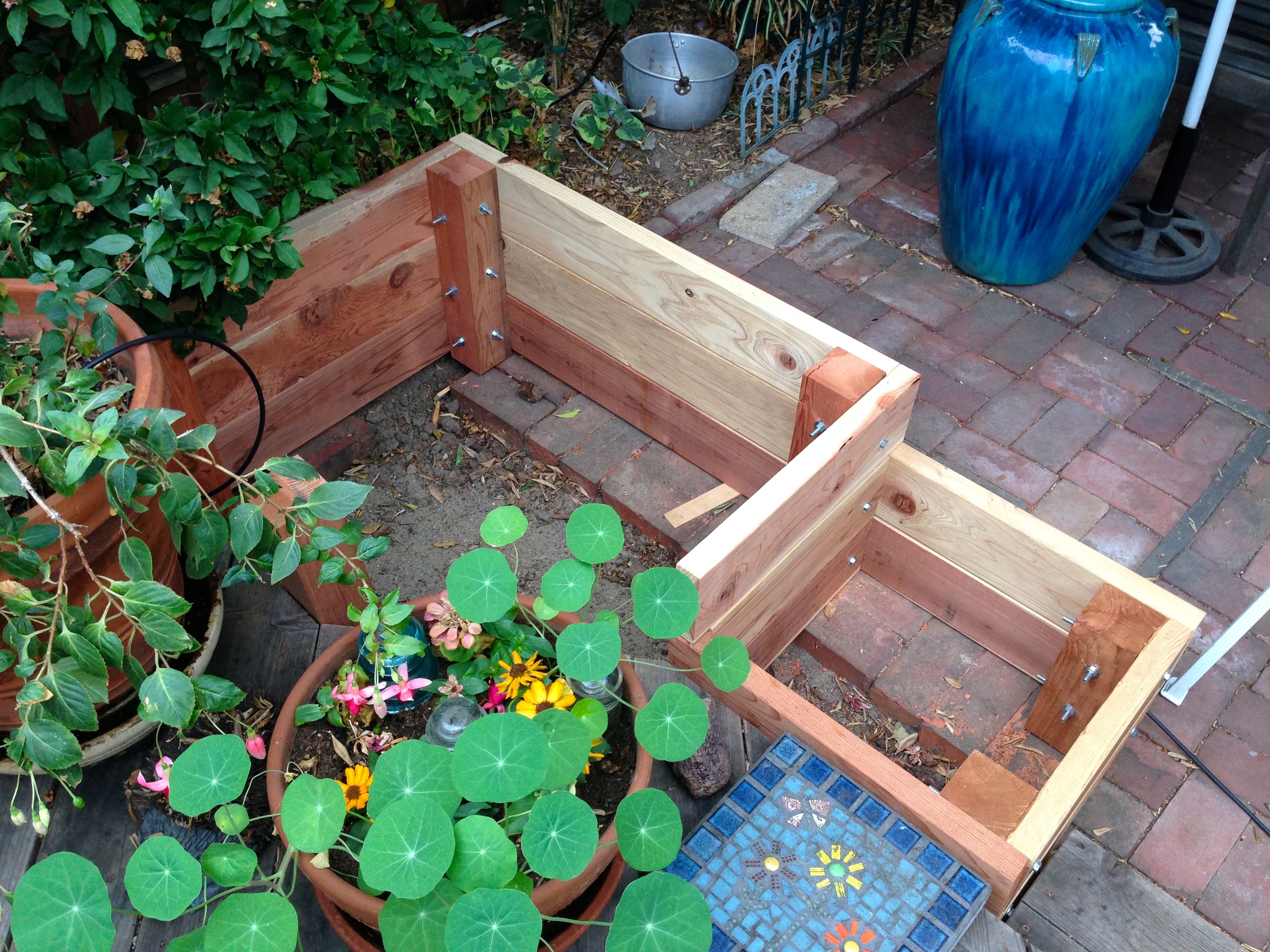 Wacky week here. Last week it was too hot and today we’ve got light rain. As promised, I snapped a couple of shots of the planter box. This is an addition to the deck. It’s not finished, but hopefully I’ll have time this weekend to put on the last couple of boards.