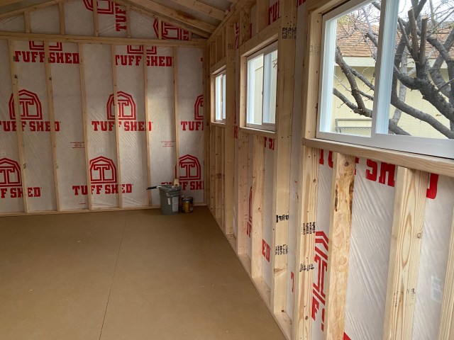 It’s 10×16 feet and nothing inside. This building will be my new marquetry and scroll saw workshop. This is where I’ll be doing most of my small work and likely will be using this as the finishing shop too. There’s a lot still to do: electrical, insulation, drywall, painting, moving tools, etc.