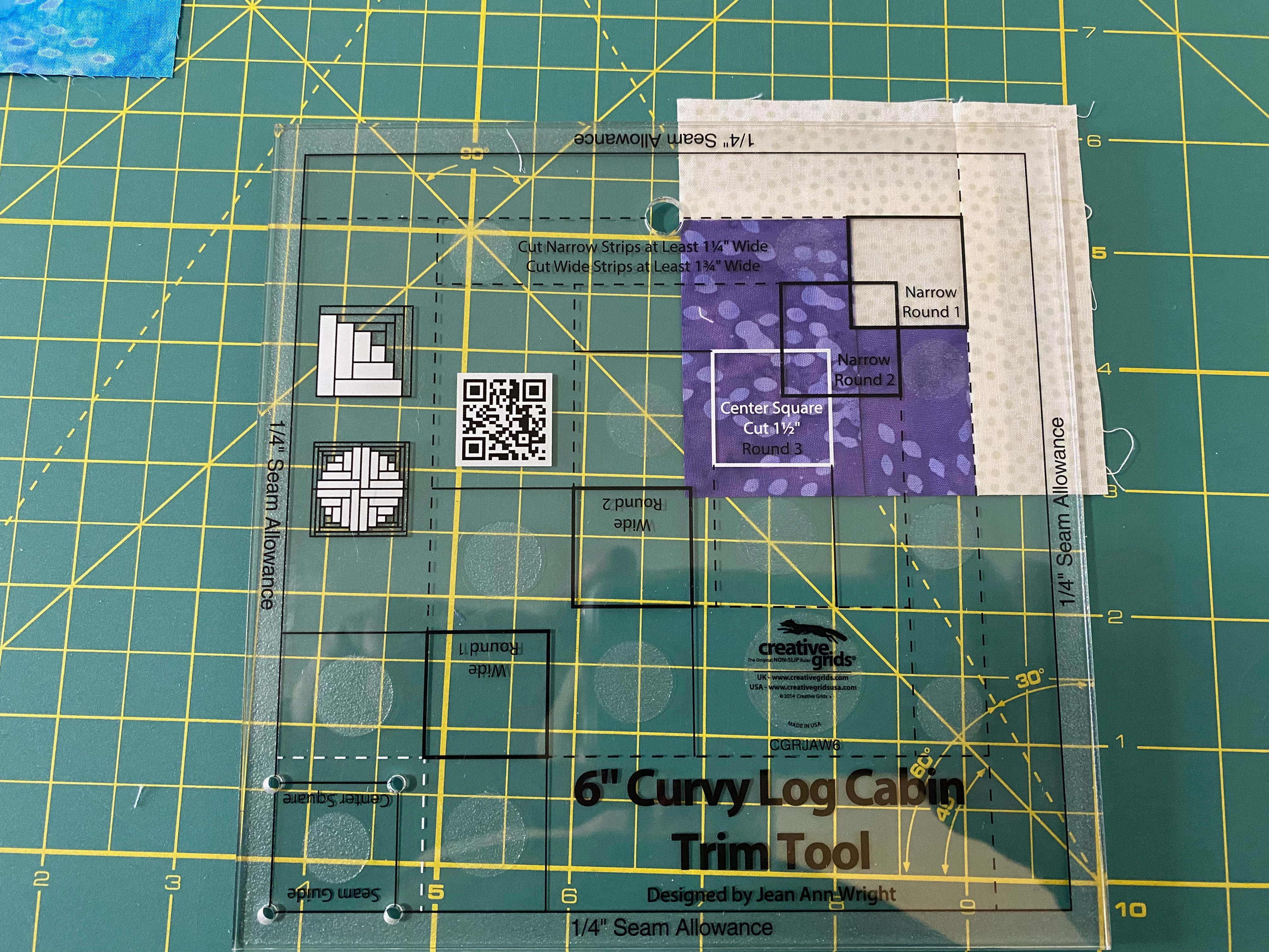 Then you use the curvy tool to trim the block. Note that there is a wide side and a narrow side. This is how you get the curve effect. On a traditional log cabin, all the strips would be the same width.