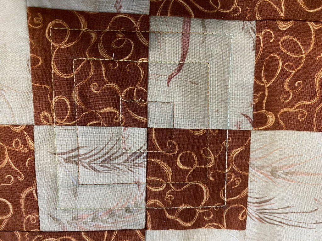 Basically it’s squares in squares. The quilt thread I’m using is a light color so it shows up best on the dark parts of the quilt. Here’s a close up of another part of the quilt: