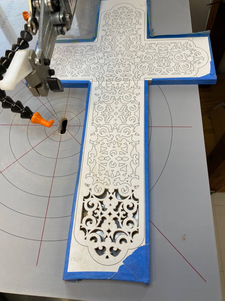 This is a filigree cross. Yes, it’s as much work as it looks like. There is somewhere around 200 cutouts for this and I expect it to take 40 hours or so to finish. I am stack cutting this which means when I’m done, I’ll have two fancy crosses. This is a project for Easter.