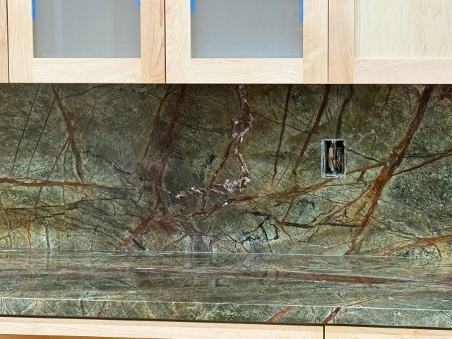 All of the stone has this intricate veining pattern. This is one of the reasons it took so long to get the counters fabricated. Some of the veining caused one slab to break and we had to buy another section and we wanted to get the veining patterns to match between the countertop and backsplash. That meant that they had to put all the slabs on their CNC machines for pictures and then a little computer work to find the right matching patterns before programming in the cuts.
