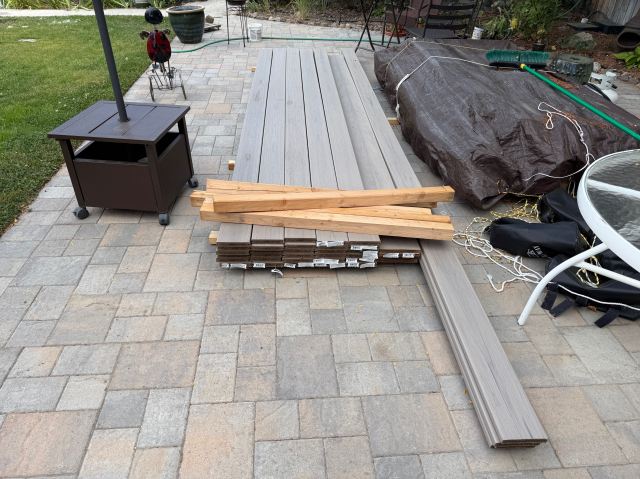 Those deck boards look lighter than they are, and I know from first-hand experience. We just replaced a ton of pasture fencing with similar 16′ boards. They’re not composite which means yours are even heavier. I don’t envy you having to move them, but at least the finish work is in sight.