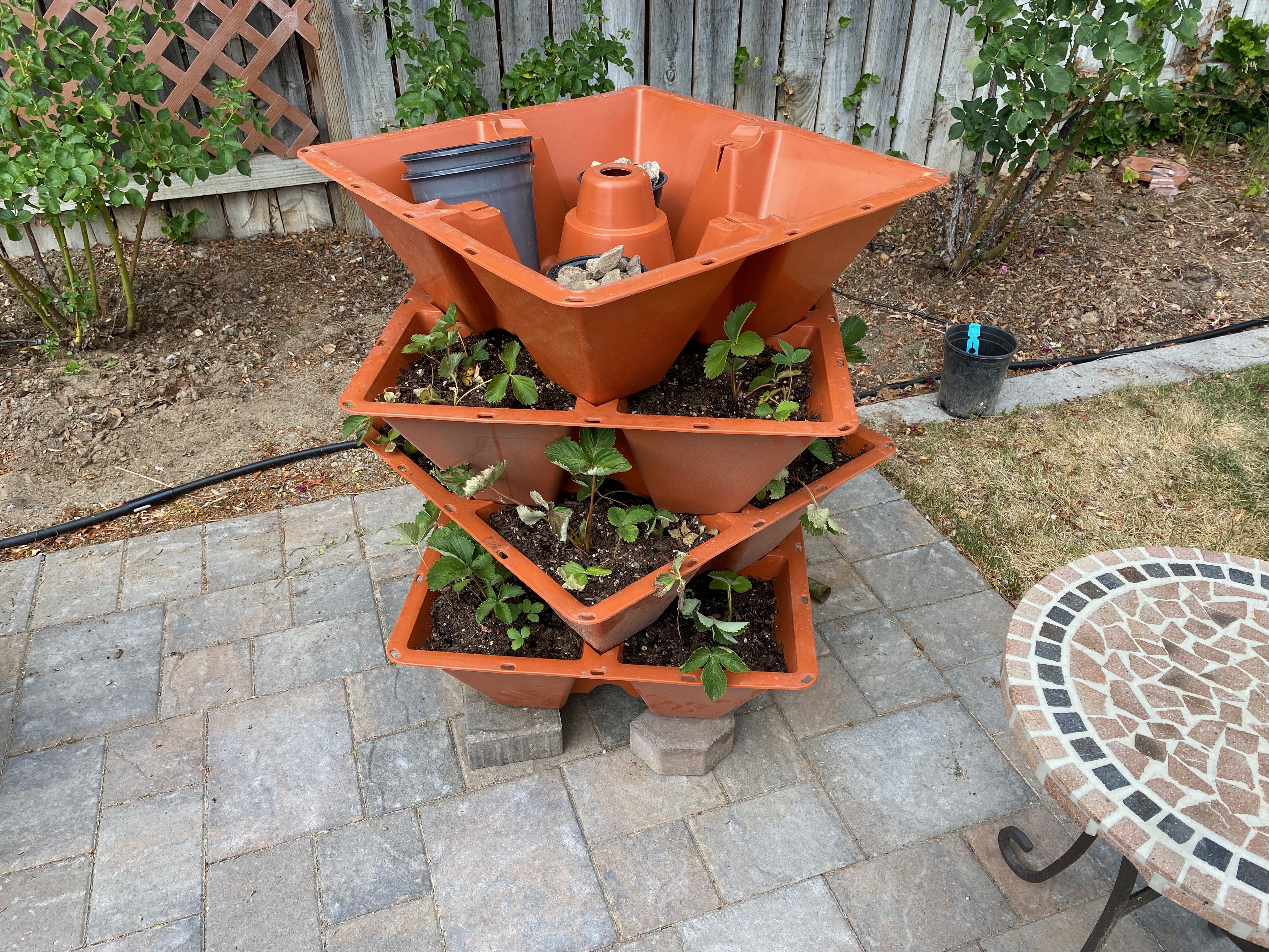 The new strawberry patch. Found these grow things/pots/planters/thingy at the garden center. Most this was Heather’s project. I did offer encouragement and did a tiny bit of lifting. Yes, the top one still needs plants.