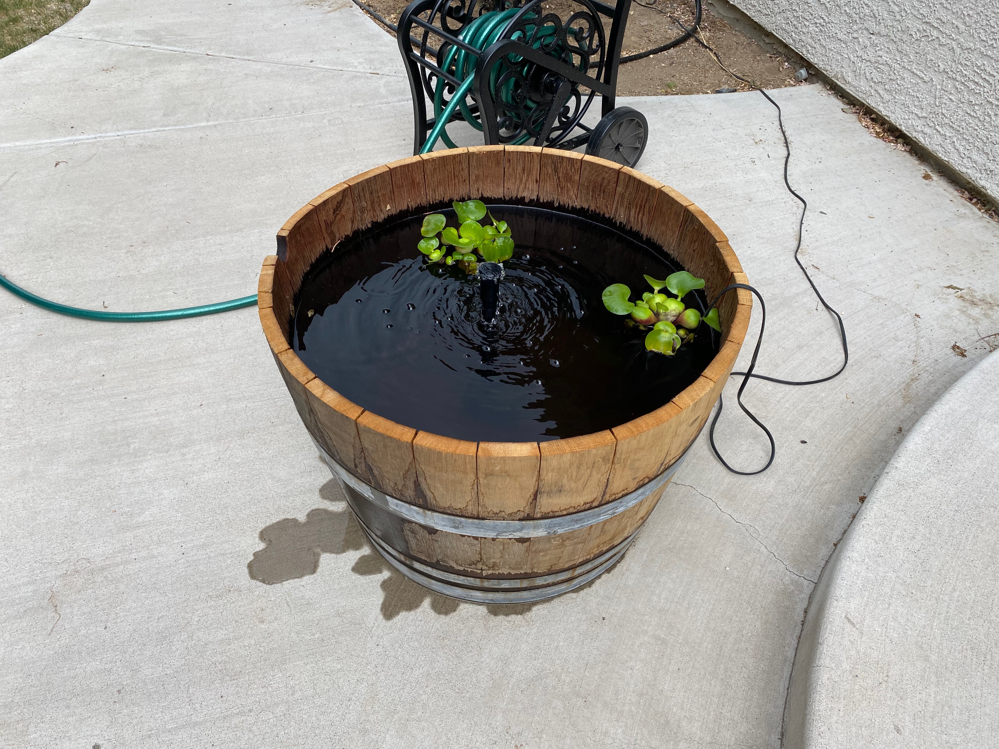 Our new water feature with floating plants. There’s a local business that will deliver half wine barrels to your house for $35 each. I mean real wine barrels – this one still smelled of a nice merlot and was purple inside.
