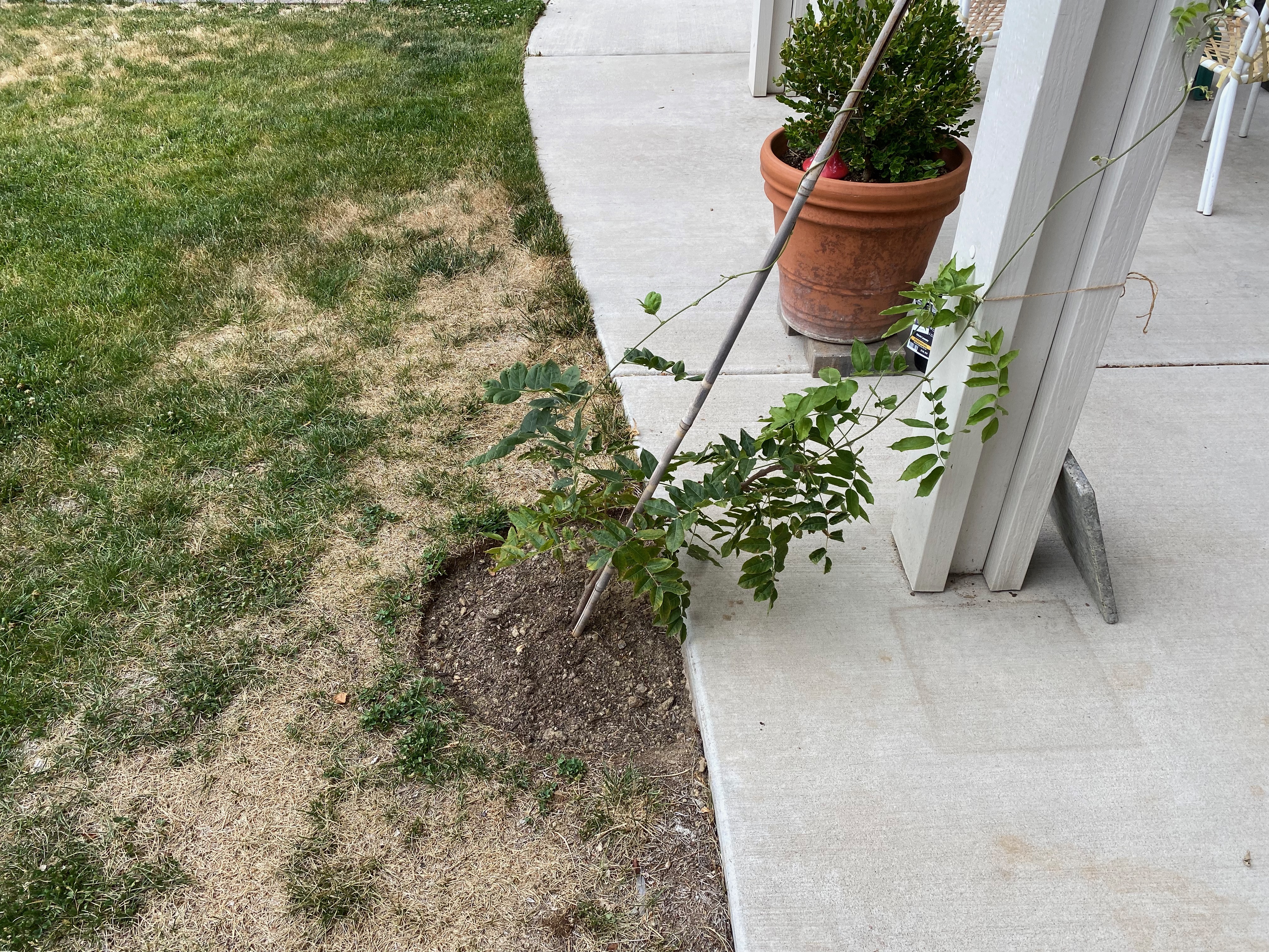 A new wisteria to grow over an arbor. I dug the hole, Heather did the planting. It took a long time to dig the hole. I asked if explosives were allowed around here – turns out you need permits, licenses, safety equipment, so I just used a pry bar, a shovel and a lot of swearing.