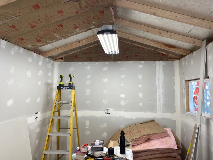 Starting on the ceiling. And everyone needs two drills on top of their ladder.