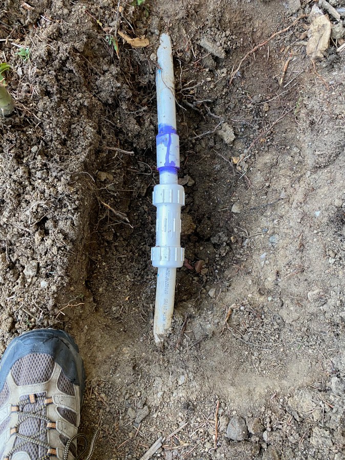 The repair – a glue joint and a compression fitting. Yes the pipe curves. The foot belongs to me.