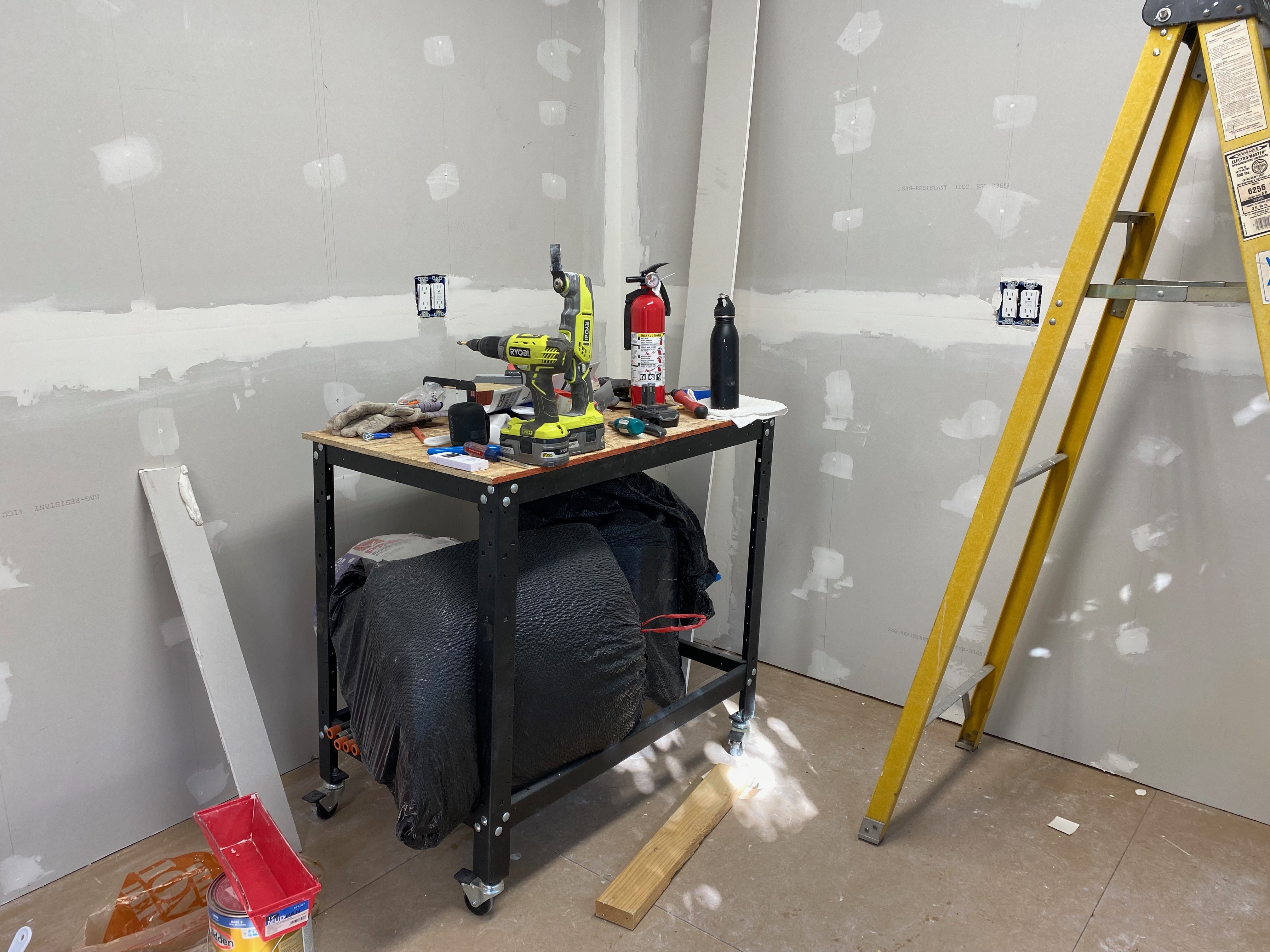 The junk cart/work table. It has wheels and three bundles of insulation. Yes, that’s a fire extinguisher – those who’ve worked in my labs understand why I have one.