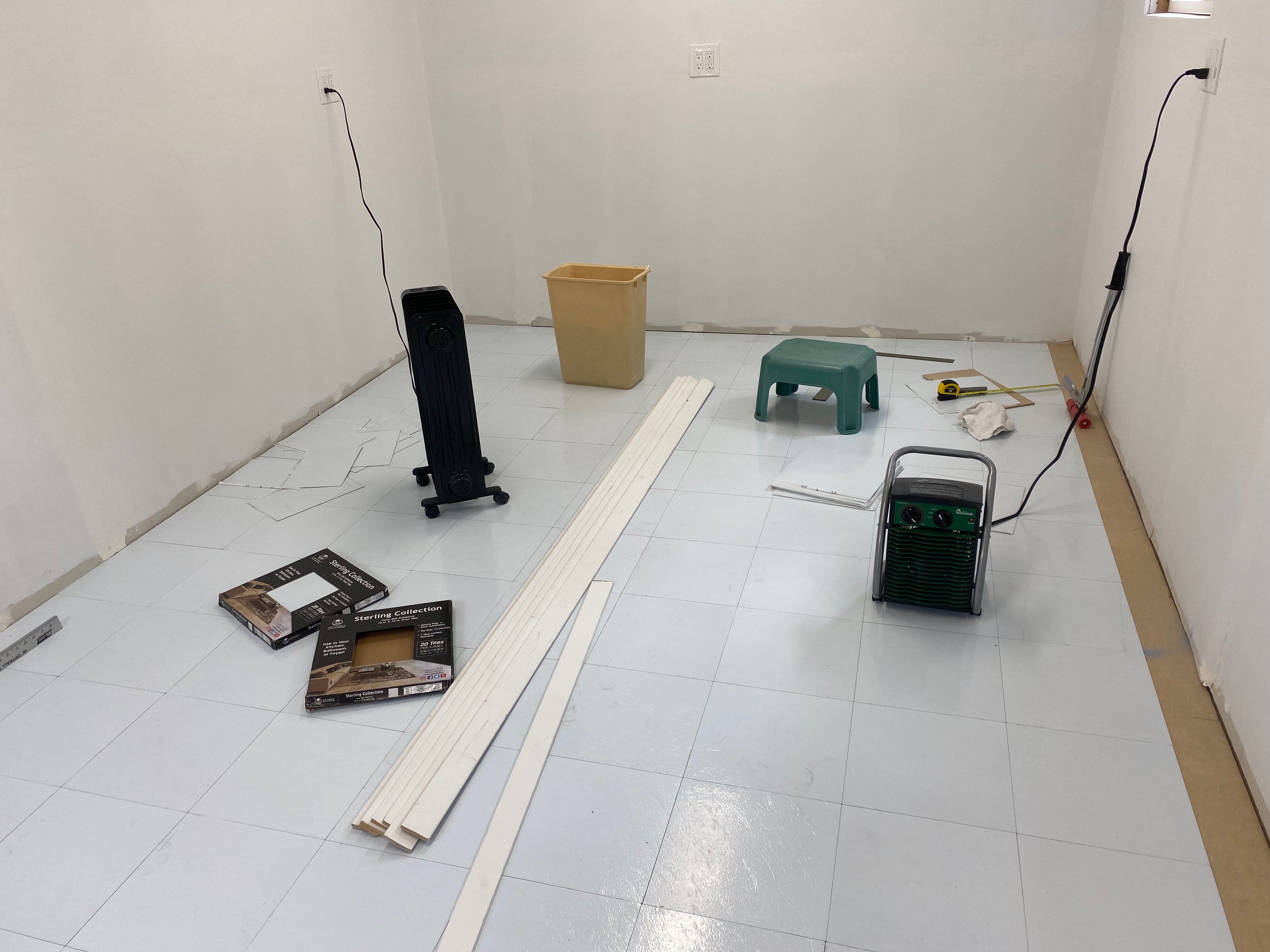 Most of the floor done. The edges require cutting the titles, which is a real pain. It’s also cold out here (high’s in the 40s Fahrenheit), hence the two space heaters. The wood on the floor is the baseboards.