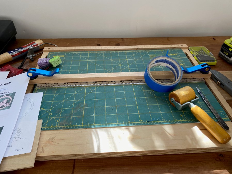 My third hand for cutting veneer. Yes, that’s a rotatory cutting mat I bought from the quilt shop. Works for knife cutting.