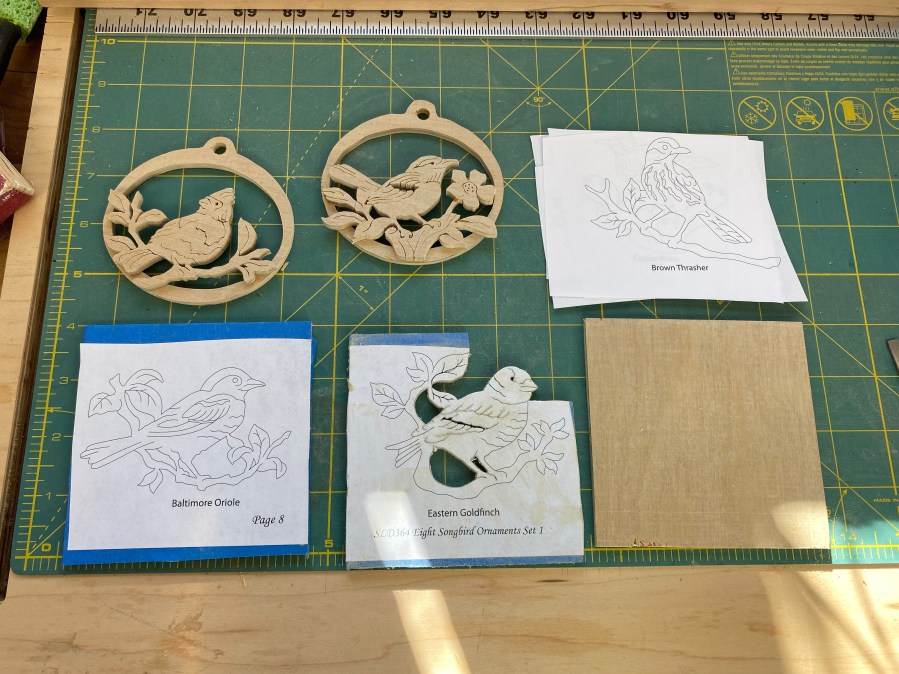 Two birds are done. Third is in progress and the fourth is waiting its turn. The blank is wait for a bird to land on it.