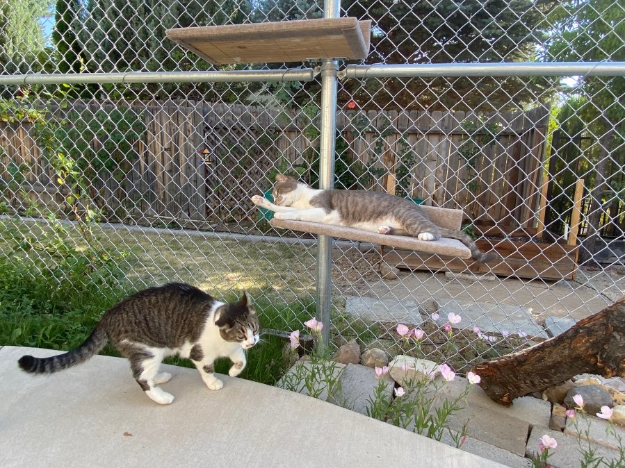 Mr. Socks trying out the lower shelf and Spotty chasing something.
